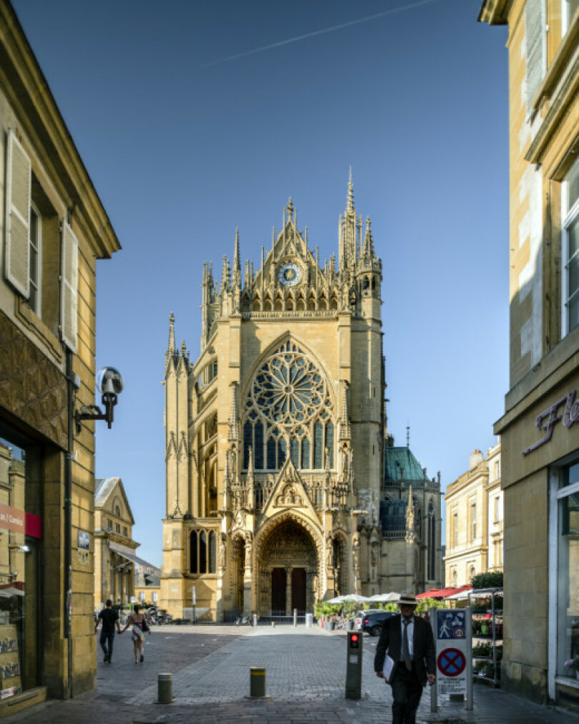 Magnifique exemple du gothique rayonnant, voire flamboyant, la bien-nommée "lanterne du bon Dieu" possède une multitude de vitraux sur une surface totale de 6.500 m2, la plus importante de France. Leurs couleurs vives teintent de reflets les colonnes de sa majestueuse nef culminant à 42 m. Le regard est irrésistiblement happé par le haut, appel symbolique à l’élévation spirituelle. "Depuis les origines du christianisme dans cette région, un lieu de culte chrétien existe à cet emplacement", raconte monseigneur Lagleize, 103e évêque de Metz ordonné en 2013.