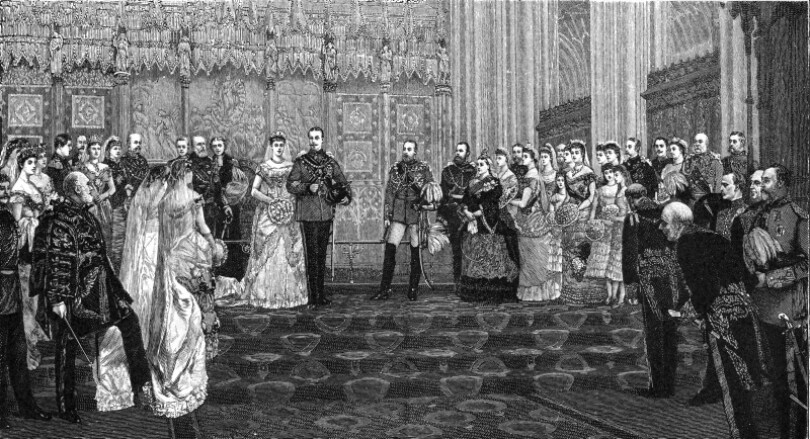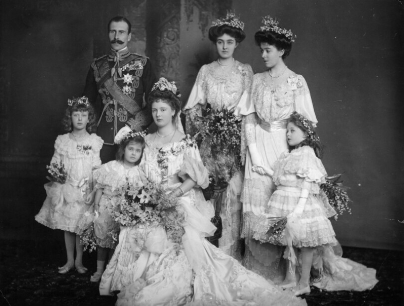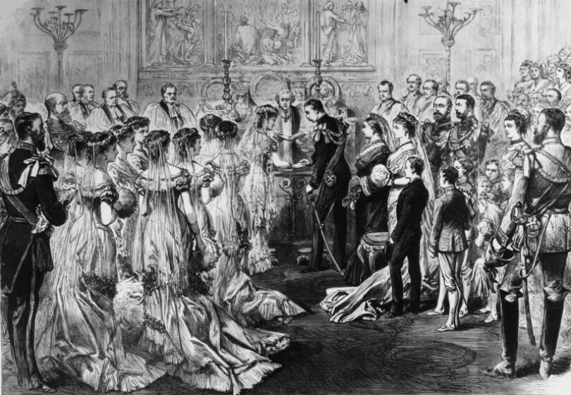 L’archevêque de Canterbury unit, ce jour-là, le prince de Galles à Alexandra, fille du futur roi de Danemark. La princesse de 19 ans, alors considérée comme la plus belle d’Europe, est photographiée dans sa robe en soie de Spitalfields, avec des dentelles de Honiton, et agrémentée d’une traîne moirée d’argent de 6,40 m.