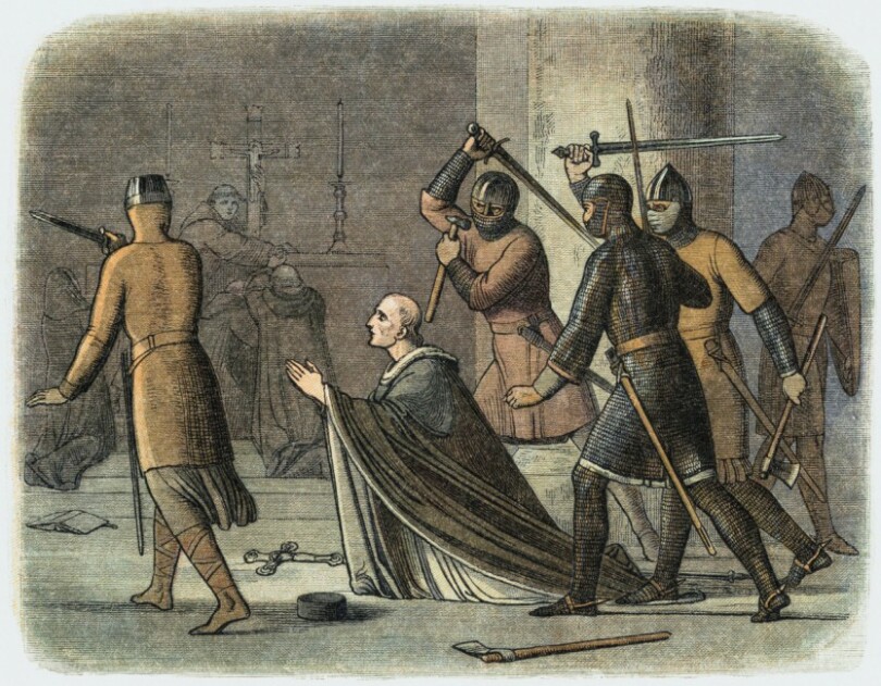 Le conflit entre les deux hommes s’envenime tellement qu’Henri II fait assassiner Thomas Becket dans sa cathédrale de Cantorbéry, le 29 décembre 1170. Les coups d’épée redoublés qu’il reçoit font éclater le crâne du prélat.