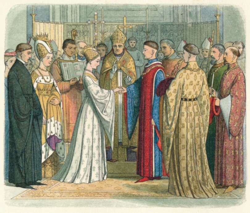 Un certain Pierre Chevion, drapier, est allé à Genève acheter des tissus de soie et de damas fabriqués à Lucques, pour confectionner les costumes du roi Charles VI, de la reine Isabeau, et de leur fille. "Ledit roi d’Angleterre, raconte Jouvenel des Ursins, […] voulut que la solennité se fît entièrement selon la coutume de France. Ils allèrent en la paroisse, c’est à savoir Saint-Jean de Troyes, où là les épousa maître Henri de Savoisy, […] archevêque de Sens. Et au lieu de treize deniers, il mit sur le Livre treize nobles [d’or]. Et à l’offrande, avec le cierge, ils offrirent chacun trois nobles."