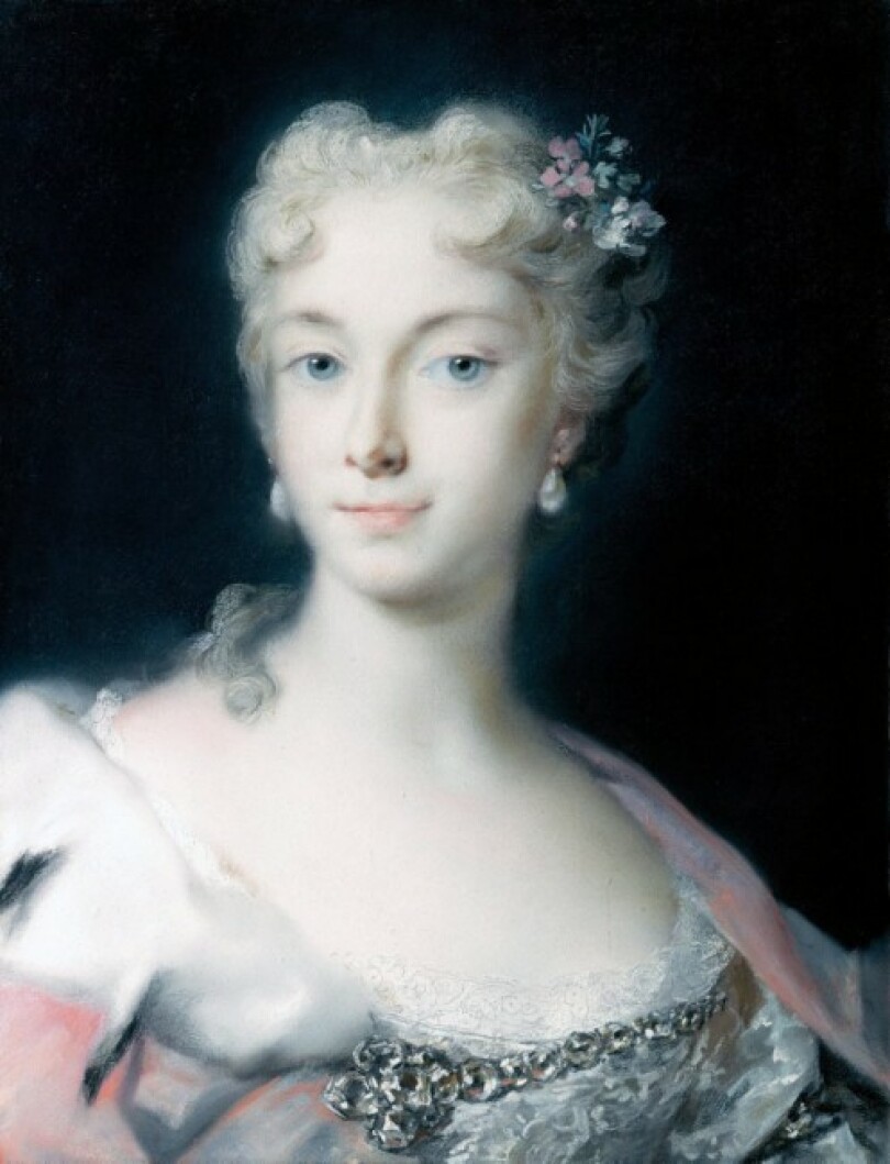 Du cœur du tableau jaillit comme un éclair le mouvement de sa main, tendue comme un arc vers une couronne d'or posée sur un coussin de velours. La pose altière, la gorge fière, les poignets couverts de perles et les mèches grisonnantes ramassées à la verticale d'un nuage de dentelle laissent percevoir la "belle personne" célébrée par tant d'observateurs de l'époque, mais aussi le tempérament pénétrant, l'ambition et l'amour-propre, le souci permanent d'être admirée. Les manières exquises et l'autorité glacée.