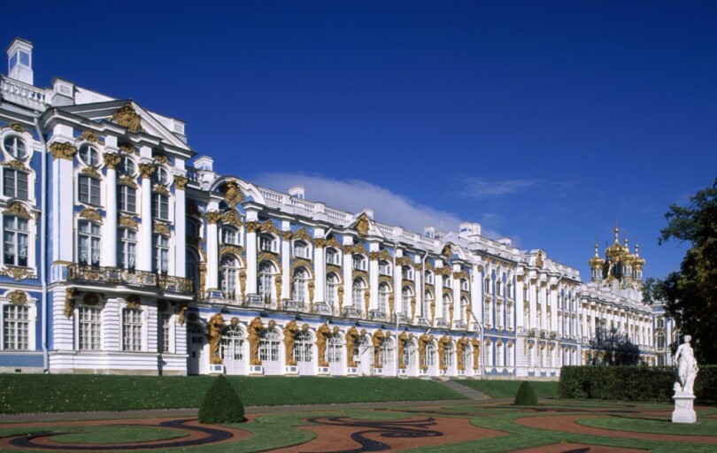 "Des murs azur dans une volée de colonnes blanches." En ce jour de froidure sibérienne, la sobre définition de l’architecte italien Bartolomeo Rastrelli ne rend pas justice à la somptueuse beauté du palais Catherine de Tsarskoïe Selo, ville aujourd’hui nommée Pouchkine. Ponctuée de puissants atlantes dorés, sa façade rayonne de couleurs, entre le bleu cristallin du ciel et la blancheur immaculée du sol.
