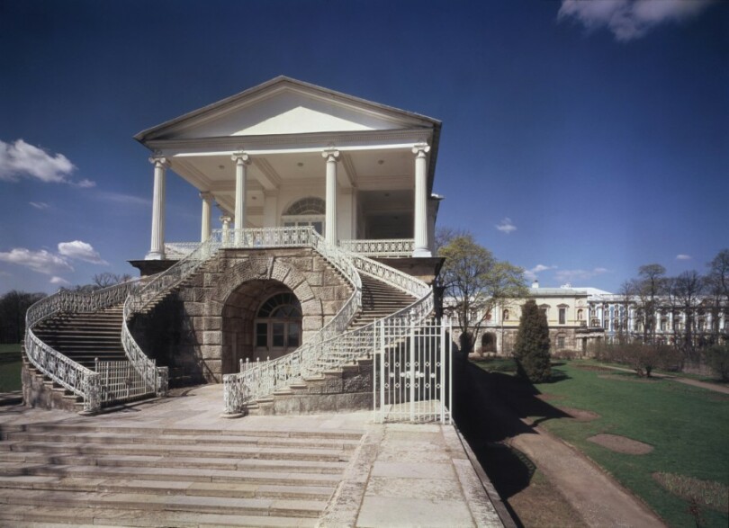 Férue d’Antiquité, Catherine charge l’architecte écossais Charles Cameron d’édifier une galerie néo-classique couverte. Flanquée d’un imposant escalier en fer à cheval, elle s’orne d’un péristyle et de colonnes ioniques et abrite une série de bustes en bronze de grands hommes de l’Antiquité. Au centre de cette large galerie, un promenoir fermé permet de profiter de la vue splendide sous des températures aussi froides qu’aujourd’hui. Dans le même esprit de "maison antique", deux pavillons de bains sont construits dans le vieux jardin. L’un est réservé aux courtisans. L’autre, destiné aux altesses, comprend une piscine intérieure, un bain de vapeur et des salons de détente.