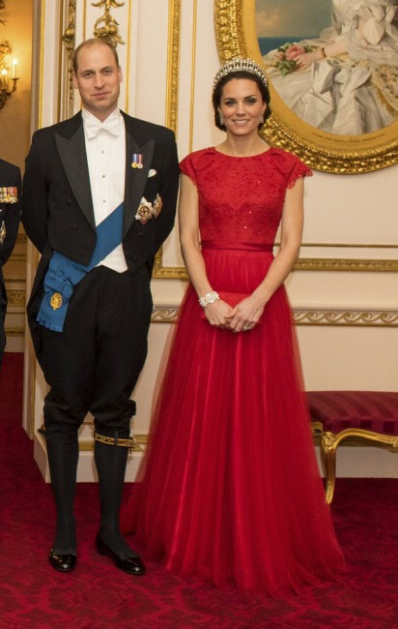 Vêtue d’une robe de dentelle rose poudré griffée Marchesa, Kate arbore le diadème aux noeuds d’amour, le Lover’s Knot, qu’affectionnait Diana et les boucles d’oreilles en perle et diamants autrefois créées pour la princesse de Galles par le joaillier Collingwood. À son cou brille le fabuleux collier bandeau Boucheron à motif floral, tout de diamants et de rubis, offert à la future Élisabeth II par ses parents le jour de son mariage, en novembre 1947; à l’annulaire de sa main gauche, la bague de fiançailles en saphir et diamants de sa belle-mère.