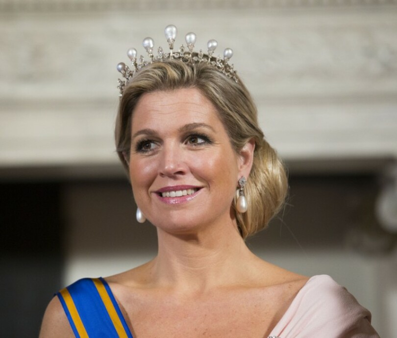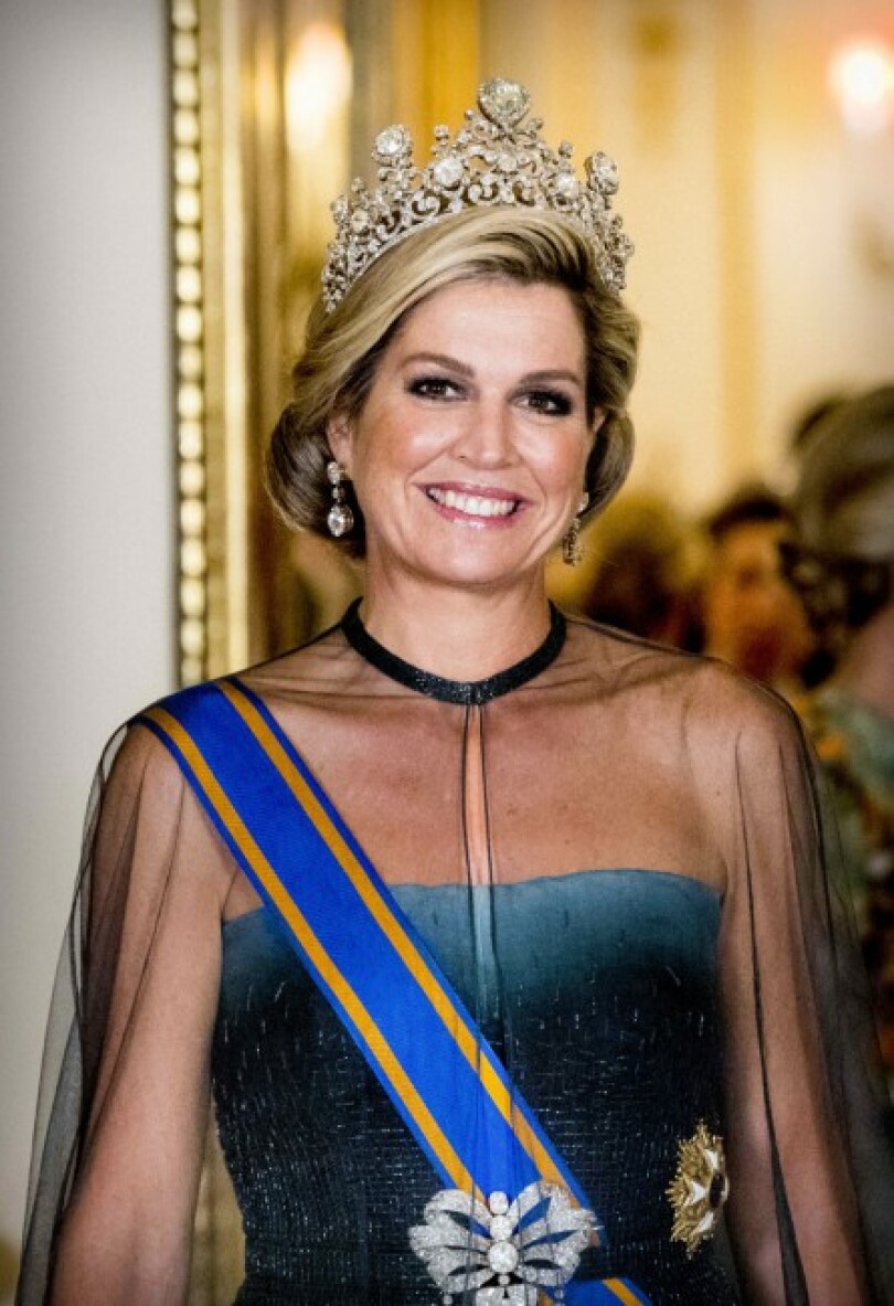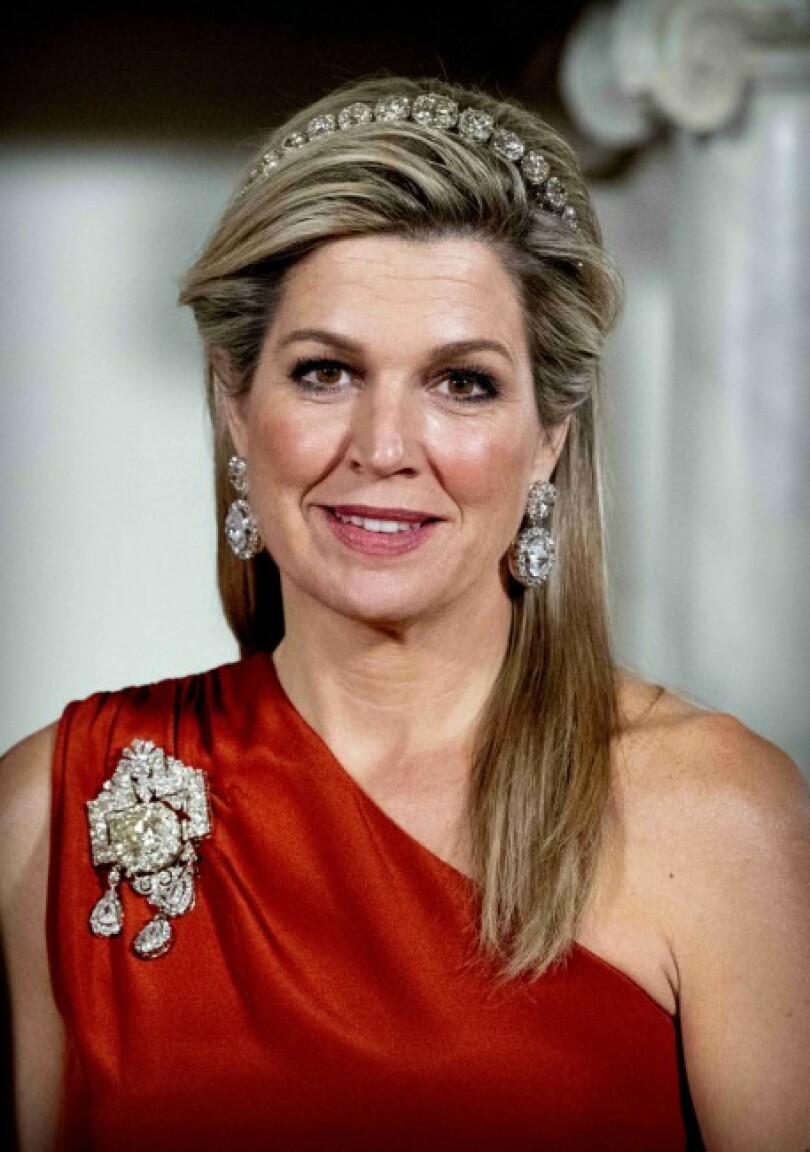 Un, deux, trois… dix… douze… La liste des diadèmes portés par la reine Maxima des Pays-Bas, depuis l’accession au trône de son époux, semble sans limite. Et le moins que l’on puisse dire est qu’elle arbore ces joyaux avec une aisance absolue. L'un des derniers en date à avoir eu les honneurs de sa coiffure, lors d’un dîner d’État offert au palais de Buckingham par la reine Élisabeth II, est le diadème Stuart.