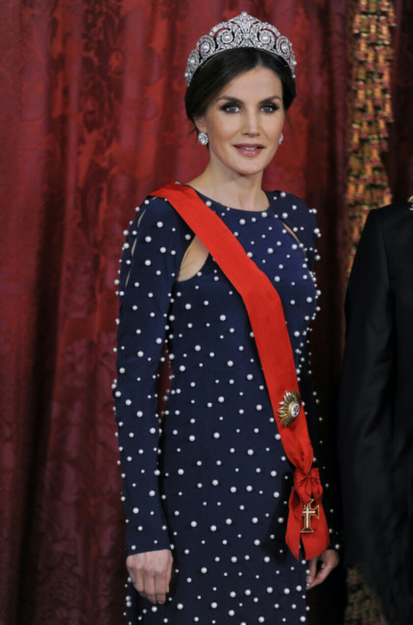Nous sommes au palais d’Orient, à Madrid, le soir du 28 novembre 2018. Le président chinois et son épouse sont les hôtes des souverains espagnols. Et Sa Majesté la reine arbore pour la première fois un des plus anciens joyaux de la famille royale: le diadème de perles et de diamants de la reine Marie-Christine (1858-1929).