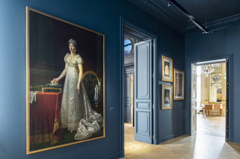 Dès le vestibule, une statue en pied de Joséphine de Beauharnais accueille le visiteur. "Nous avons eu la chance de pouvoir réaliser la réplique grandeur nature de l’œuvre de Vital-Dubray, qui se trouve à Versailles." Fidèle cliente du joaillier, l’impératrice est aussi présente à l’étage noble, d’après un portrait de Robert Lefèvre. À ses côtés, se tient Napoléon Ier en costume de sacre. "Le palais Fesch d’Ajaccio, où est exposé l’original peint par François Gérard, nous a permis de reproduire l’œuvre." L’Empereur arbore l’épée consulaire dont les pierres, incluant le célèbre Régent de 140 carats, ont été serties par Marie-Étienne Nitot, le fondateur en 1780 de ce qui deviendra la maison Chaumet.