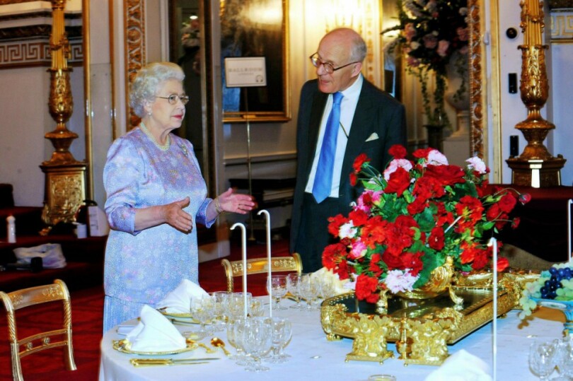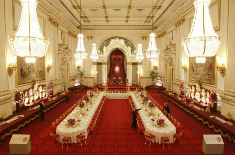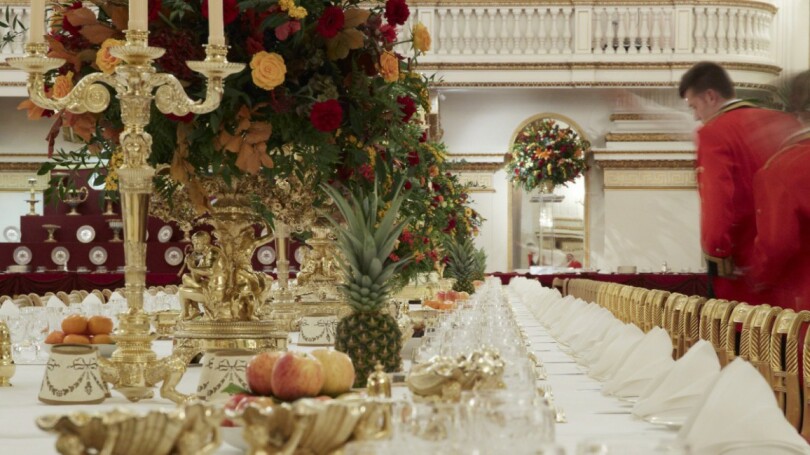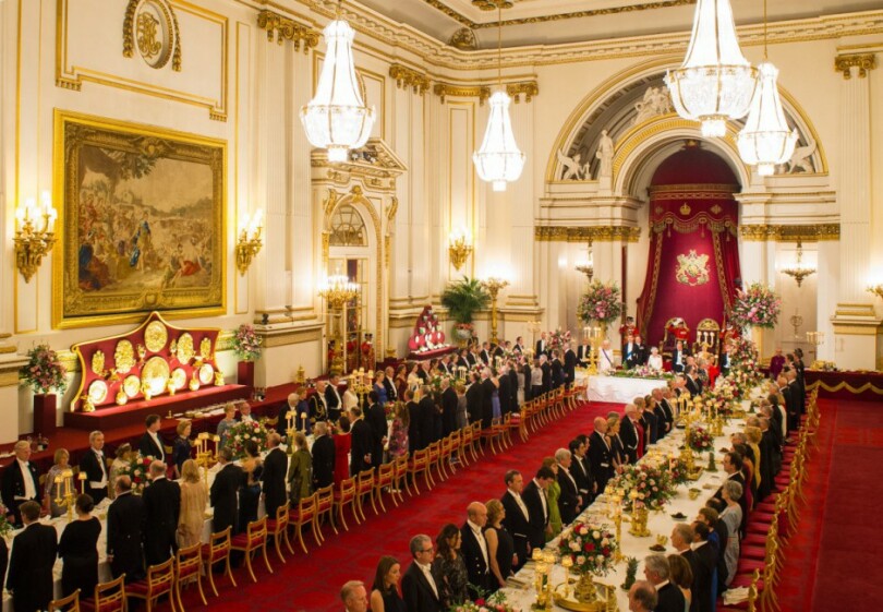Banquet d'État au palais de Buckingham. De coupes de fruits rebondies, disposées çà et là, s'échappent des raisins et des ananas discrètement prédécoupés de manière à faciliter la tâche des gourmands. Le long des murs de la salle de Bal ont été dressés des buffets offrant à l'admiration des hôtes d'Élisabeth II les joyaux d'orfèvrerie du grand service de vermeil, un trésor de quatre mille pièces aux dimensions spectaculaires, plats, soupières, candélabres et autres centres de table réalisés au début du XIXe siècle pour le souverain George IV.
