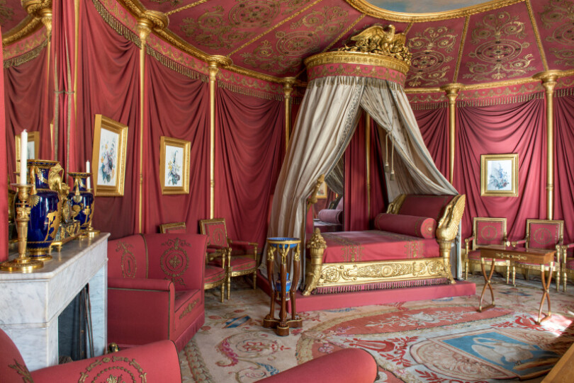 Rouge également la chambre de Joséphine. Redécorée par Louis-Martin Berthault, dernier architecte de la Malmaison, elle est aménagée en cercle. Des aquarelles de fleurs du peintre Pierre-Joseph Redouté ornent les tentures cerise. Le lit à baldaquin est paré de cygnes dorés. Funeste présage? C’est ici que l’impératrice rendra son dernier souffle, en 1814.