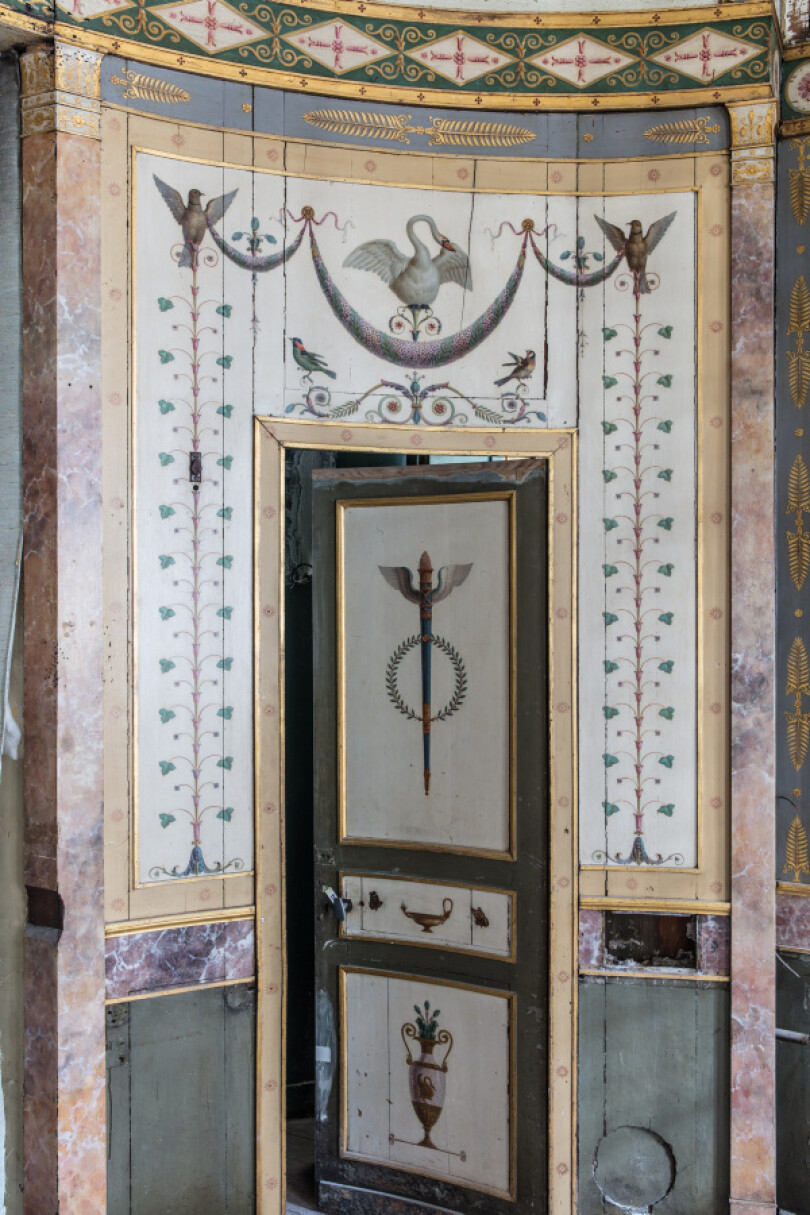 Perchée sur un échafaudage, une restauratrice en combinaison blanche et masque anti-émanations manie le pinceau avec un soin infini sur la hanche d’une Psyché. "Notre mission est de mettre à jour, à l’issue d’une étude stratigraphique, la couche picturale d’une époque déterminée, en l’occurrence celle de la fin du XVIIIe siècle. Il s’agit donc d’enlever les ajouts les plus récents au moyen d’un gel par ionisation que nous avons mis au point", explique Geneviève Taillefert, cofondatrice avec son mari de l’atelier ARTsa, dédié à la restauration de décors peints monumentaux.