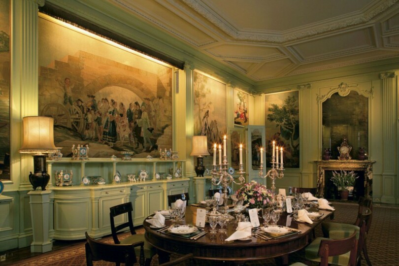 C’est ici que l’on déguste l’afternoon tea en profitant de la vue sur le parc et la forêt qui s’étendent sur plus de 240 hectares (le domaine agricole qui l’entoure, lui, avoisine 10.000 hectares). Dans la salle à manger, la table est dressée. Pour les grandes occasions, elle peut atteindre jusqu’à 4m de longueur. La porcelaine Blumenthal repose sur des sets en bois où figurent les chevaux préférés de la reine. Au mur, des tapisseries réalisées à partir de cartons de Goya sont un cadeau du roi d’Espagne Alphonse XII, lors d’une visite d’Édouard VII et Alexandra à l’Escurial.