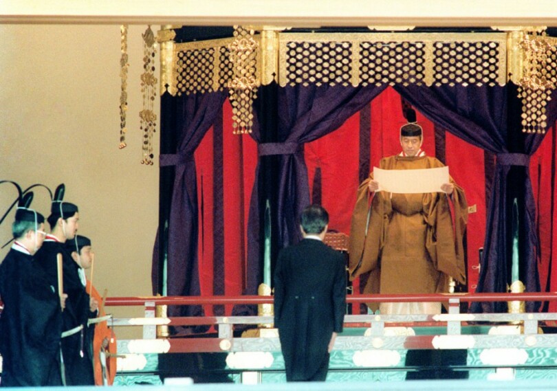 Akihito est devenu le 125e empereur du Japon le jour même du décès de son père Hirohito, le 7 janvier 1989. Vingt-deux mois plus tard, pour respecter la période de deuil, se sont déroulées les cérémonies de proclamation de couronnement. Le moment le plus spectaculaire pour nous, Occidentaux, fut sans nul doute par son dépouillement extrême, par la beauté des costumes et par les visages totalement figés de ses principaux acteurs, le Sokui Rei Seiden no Gi.