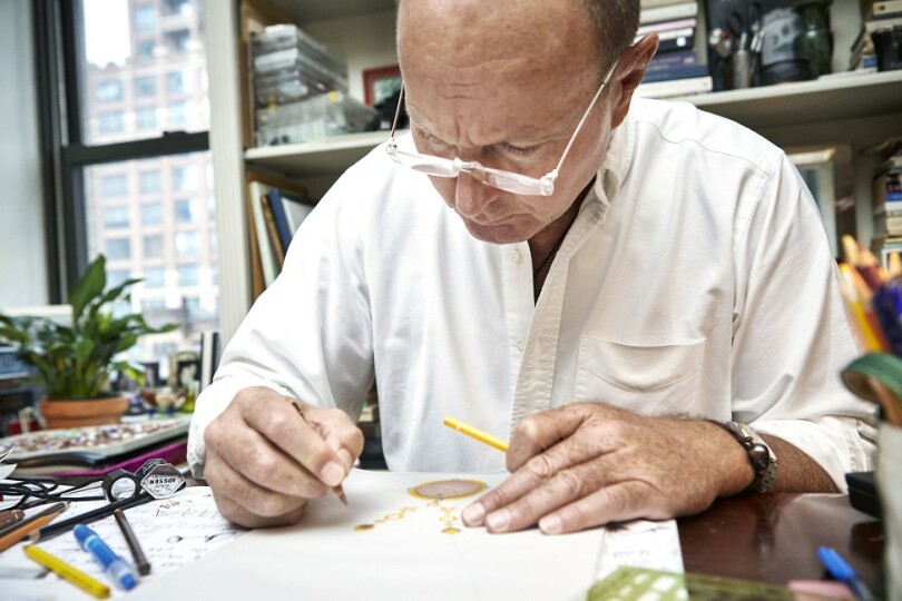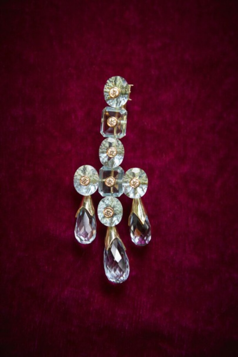 Dans un coin du salon, son bureau trône devant une bibliothèque. Sur la table, pots de crayons colorés, catalogues d’expos et échantillons en tout genre se mêlent dans un joyeux fouillis. Parmi les présentoirs et les plateaux de velours couverts de gemmes acidulés, un croquis à la gouache. "C’est un projet pour une amie, explique le prince. Je crée mes pièces, mais j’aime aussi transformer des bijoux vintage ou des pierres familiales, en leur apportant ma touche personnelle. Mes clientes savent que je peux moderniser un héritage qu’elles gardaient au fond d’un tiroir. Je fais revivre leurs souvenirs!"