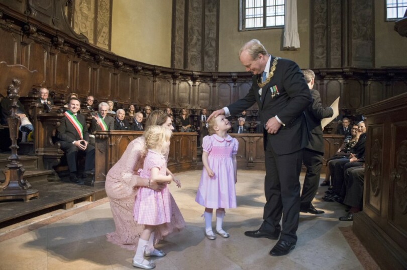 Quelques minutes plus tard, d’un geste solennel, le duc, ému, remet à Cécilia, 4 ans, le titre de comtesse de Berceto. Luisa, âgée de 5 ans, reçoit celui de marquise de Castell’Arquato.