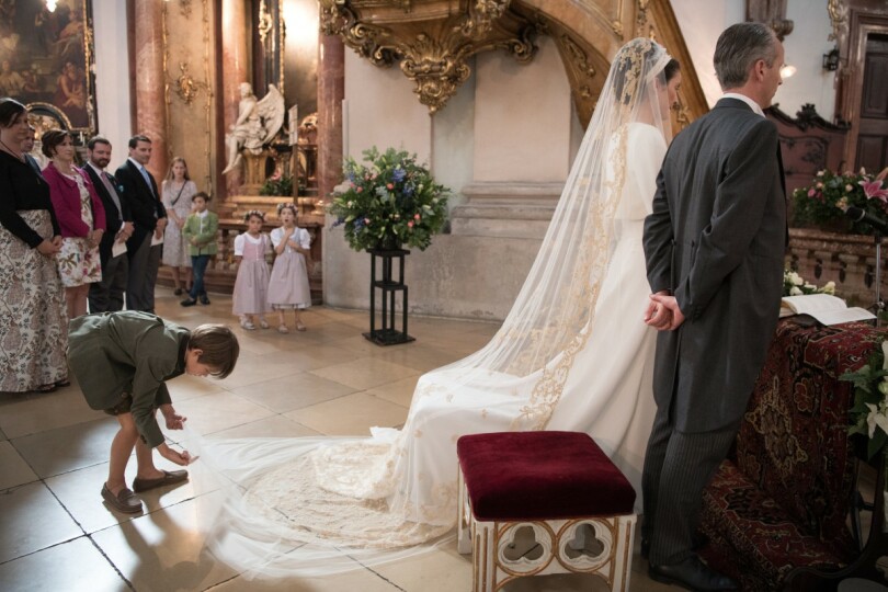 Heureusement, tout est rentré dans l’ordre et c’est presque à l’heure que Magdalena, escortée par ses deux témoins Katie Bolldorf Edle von Grazinia et Monika Hebrard, fait son entrée dans la Piaristenkirche. "Cher Jean, chère Magdalena, c’est avec joie que l’Église vous accueille pour le jour le plus important de votre vie." Don Xandro Pachta-Reyhofen, de la Communauté Saint-Martin, donne le ton d’une messe simple et fervente.