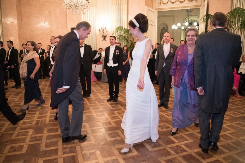 Il fait déjà nuit sur Vienne quand les invités prennent place autour des tables rondes disposées dans les salles du palais Auersperg. Le temps de savourer un filet de bœuf fondant et une panna cotta vanillée aux fraises, et le prince Jean porte un premier toast à la santé des mariés, qui reprennent bien vite le chemin de la salle de bal. Tradition viennoise oblige, Magdalena se lance dans une valse virevoltante avec son frère David, tandis que Jean d’Haussonville fait danser sa maman, puis sa sœur.