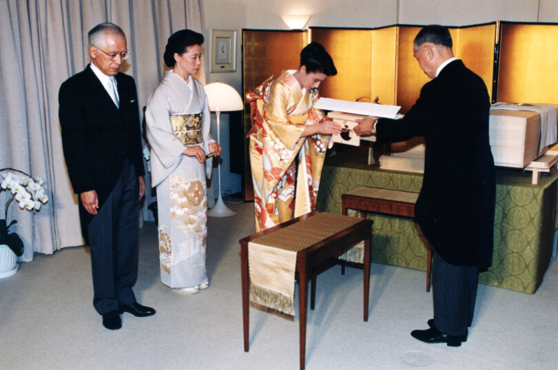 Au côté de son époux en habit, elle se rend auprès de l’empereur et de l’impératrice. Il est 15 heures. Naruhito annonce solennellement à ses parents que la princesse est sa femme. Akihito lui répond par ses voeux. Seule manifestation publique de la journée, la parade.