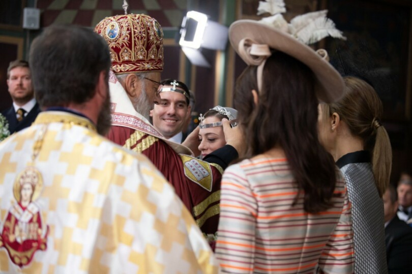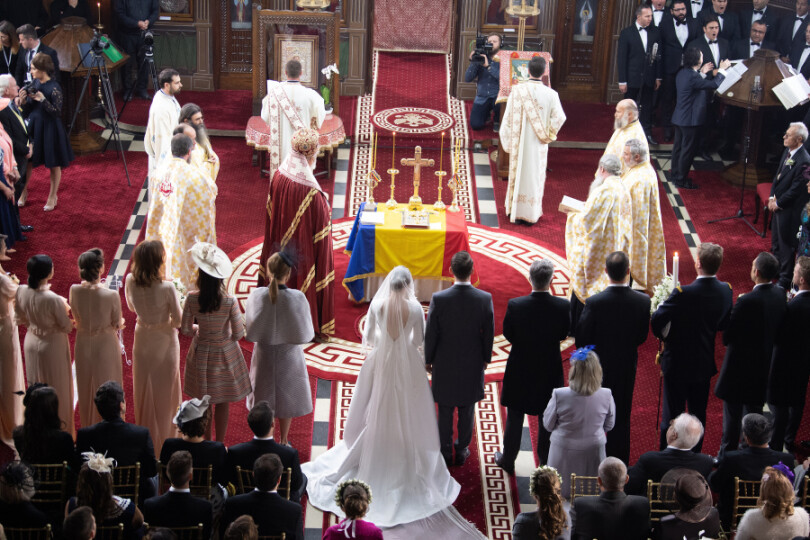 Devant la basilique Sfântul Ilie, un écran géant a été dressé. Tandis que le ballet des berlines sombres dépose, petit à petit, les invités face au perron festonné de brassées de fleurs blanches, la foule grossit d’heure en heure. À 14h30 précises, juste après le long cortège des témoins et demoiselles d’honneur, Nicolas de Roumanie arrive enfin, suivi de près par la mariée, ravissante dans une robe en soie ivoire.