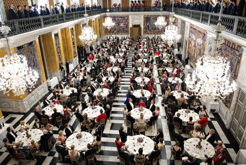 Les trompettes retentissent. Précédés par le maître chambellan Michael Ehrenreich, le roi de Suède Carl XVI Gustaf et son épouse la reine Silvia font leur entrée. Elle est coiffée du diadème de diamants et rubis offert en 1905 par Édouard VII, pour les noces de sa nièce Margaret de Connaught avec le futur roi Gustaf VI Adolf de Suède. La princesse héritière Victoria, qui arbore sa tiare favorite en aiguilles de diamants provenant de son arrière-grand-mère la reine Victoria, et son époux, le prince Daniel, ferment le cortège.