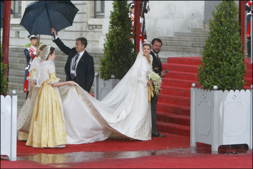 Depuis 7 heures du matin, la future princesse, dans l'intimité d'une chambre du palais de l'Orient, s'apprête à l'abri des regards. Ses demoiselles d'honneur, dona Ana Codorniu Alvarez Toledo et dona Claudia Gonzalez Ortiz, l'aident à déployer sa traîne de quatre mètres cinquante. Sans doute portent-elles un regard inquiet à la fenêtre. Une pluie londonienne, dont Charles d'Angleterre est coutumier, affole les maîtres de cérémonie de la Casa Real.