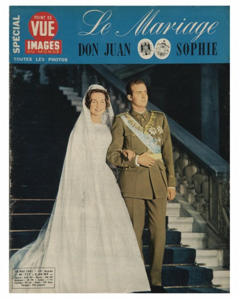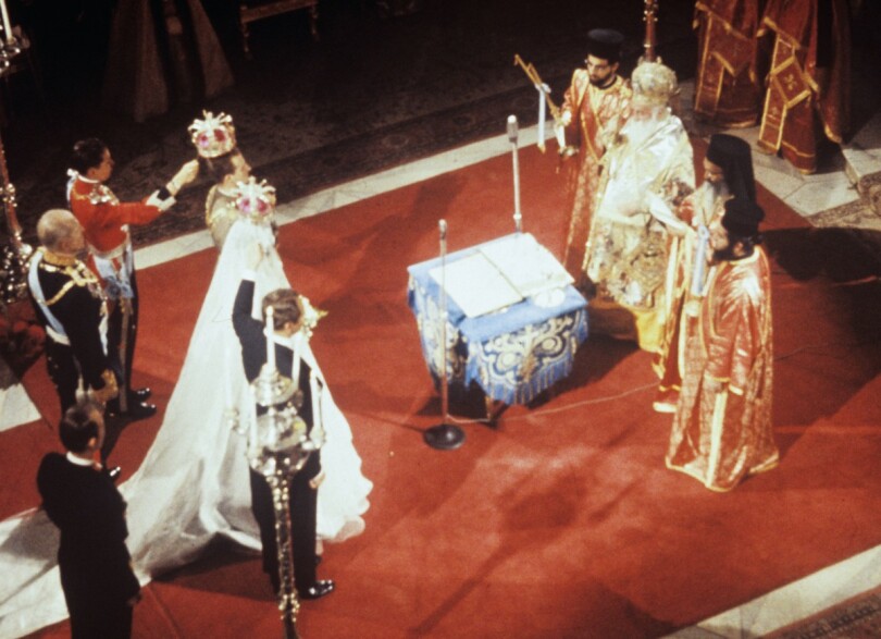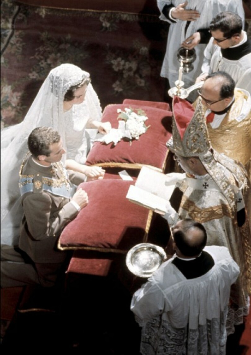 Monseigneur Printezi, l’archevêque catholique d’Athènes, accueille le souverain et la jeune fiancée au son de l’Alleluia du Messie de Haendel. Dans le sanctuaire fleuri de guirlandes d’oeillets rouges et jaunes, le roi Paul donne symboliquement la main de sa fille à don Juan Carlos.