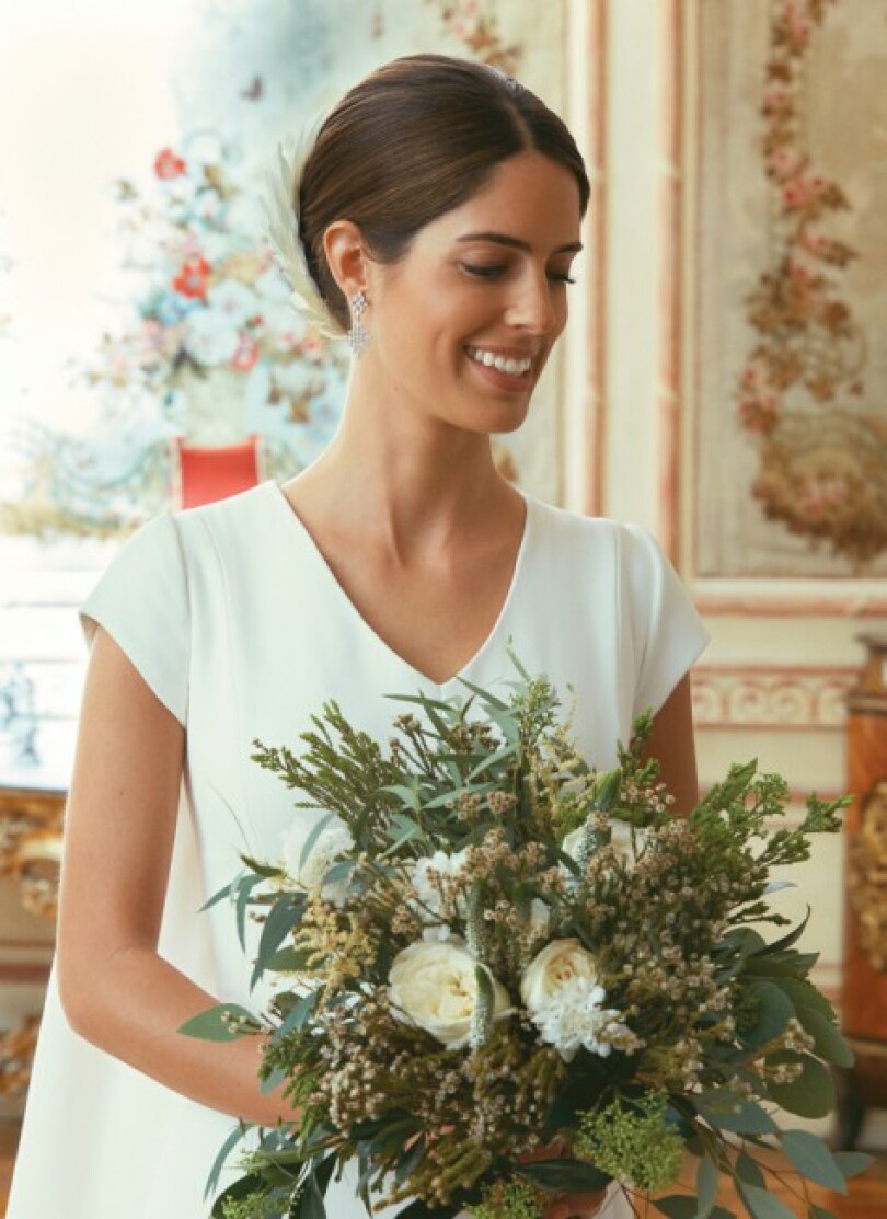 Hormis une paire de pendants et un bracelet en diamants, Sofía ne porte aucun bijou. La tiare ayant appartenu à Eugénie de Montijo et arborée le jour de ses noces par Cayetana Fitz-James Stuart, est restée dans son écrin. Sofía a choisi une simple coiffe en plumes de la créatrice Teresa Briz Haute Hats pour orner un chignon bas. Entre ses mains, un bouquet champêtre de gypsophiles, roses et autres fleurs blanches.