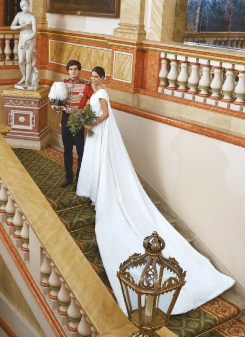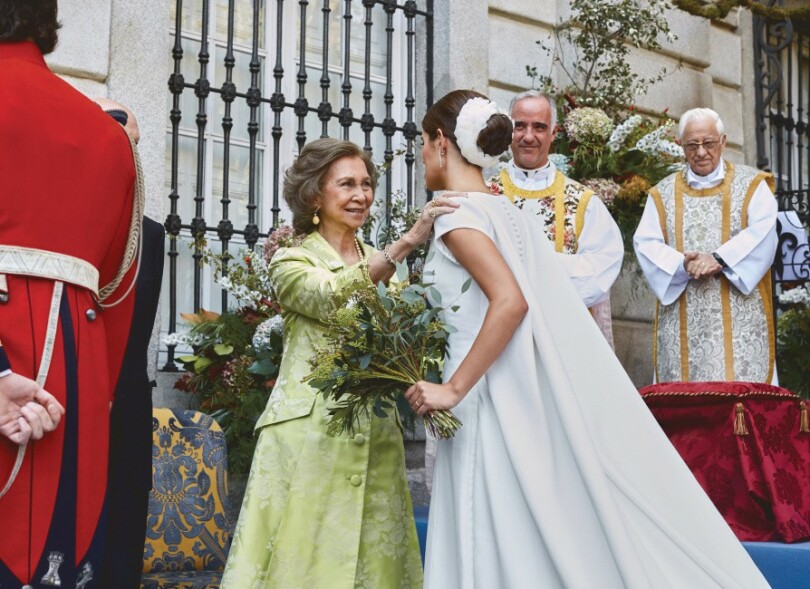 Au bras de son frère aîné Fernando, Sofía Palazuelo suscite la surprise. Sa robe, aux lignes simples d’organza et de tulle, s’agrémente d’une cape amovible. Comme le souligne sa tante Tereza Palazuelo, créatrice du vêtement nuptial: "Tout le monde connaît le goût de Sofía pour la sobriété. Je crée des robes depuis trente ans, mais accomplir ce long travail pour ma nièce était un bonheur vraiment particulier."