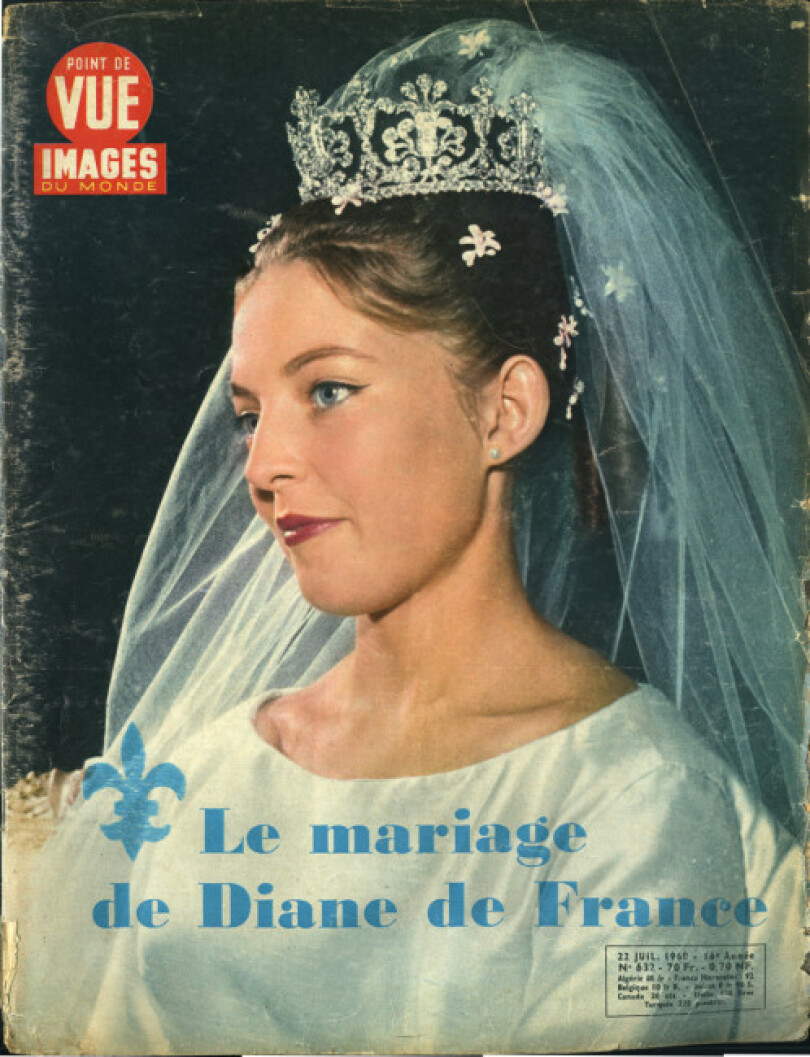 Enfin, elle foule ce tapis rouge obtenu de haute lutte. Au bras du Comte de Paris, chef de la maison de France, qui la conduit depuis le château d’Altshausen jusqu’à l’autel de l’église baroque du domaine, vouée à saint Michel. Coiffée du diadème Wurtemberg aux 134 diamants montés en fleurs, rayonnante dans sa robe en soie duchesse, griffée Dior et créée par un jeune styliste nommé Yves Saint Laurent, Diane de France s’avance entre deux haies de villageois dont les acclamations enthousiastes couvriraient presque le bruit des 101 coups de canon saluant un mariage royal.