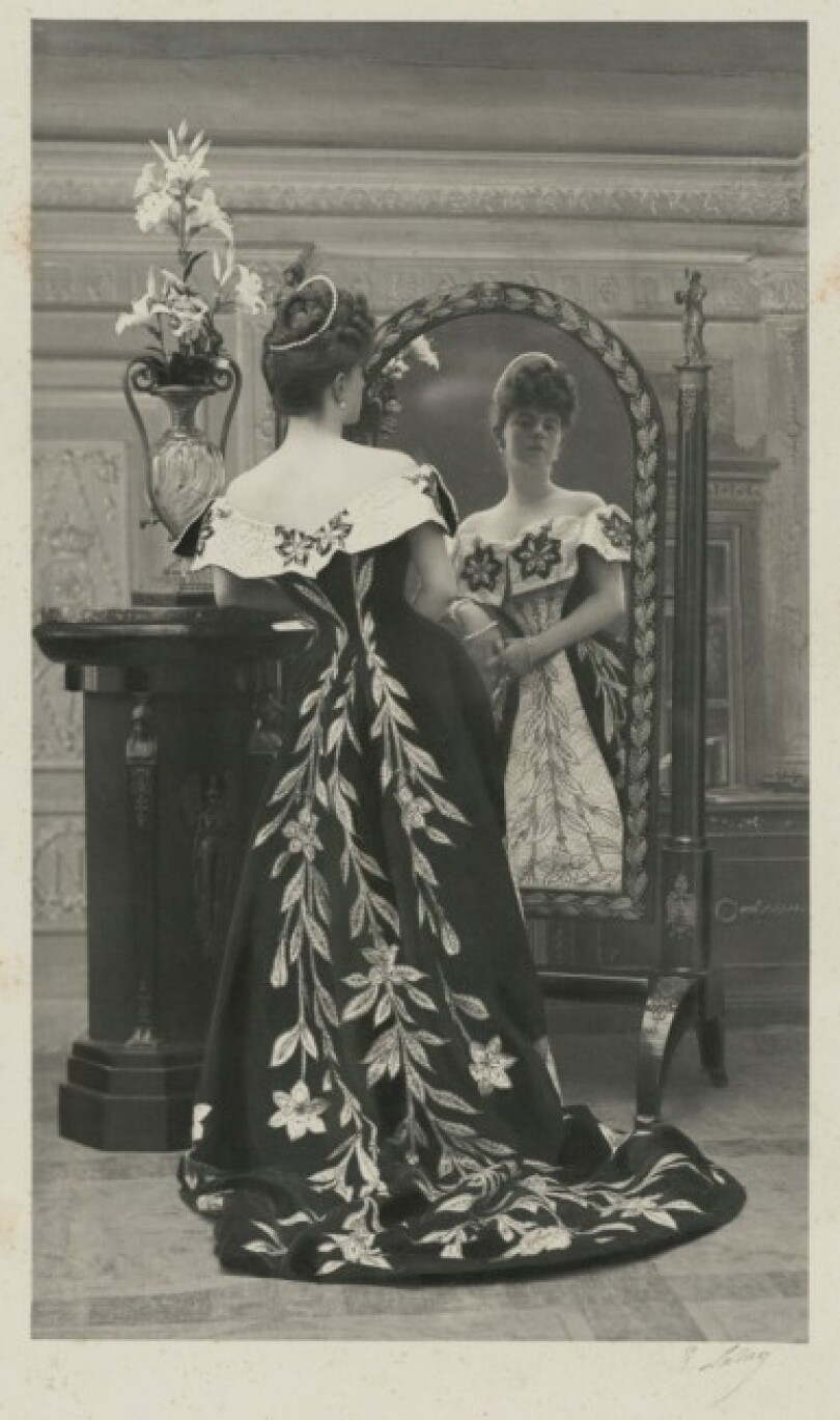 Alors elle puise sans compter dans la fortune Greffulhe pour satisfaire l’orgueil de Henry et assouvir sa propre passion: "Je le possède enfin ce voile tant aimé, et mes sens haletants recherchent en ses plis soyeux le souvenir de ses formes parfaites et des arômes enivrants." "Tea-gown" en soie brochée aux motifs floraux de velours bleu cisel sur fond de satin vert, "robe byzantine" en lamé rehaussé de perles de verre, paillettes et cannetilles, "khalat"- cape- d'étoffe d'or offerte par le tsar Nicolas II...