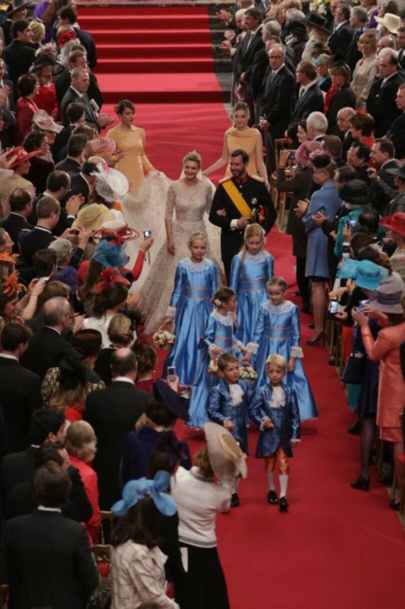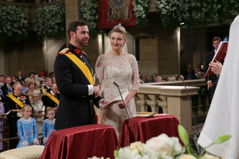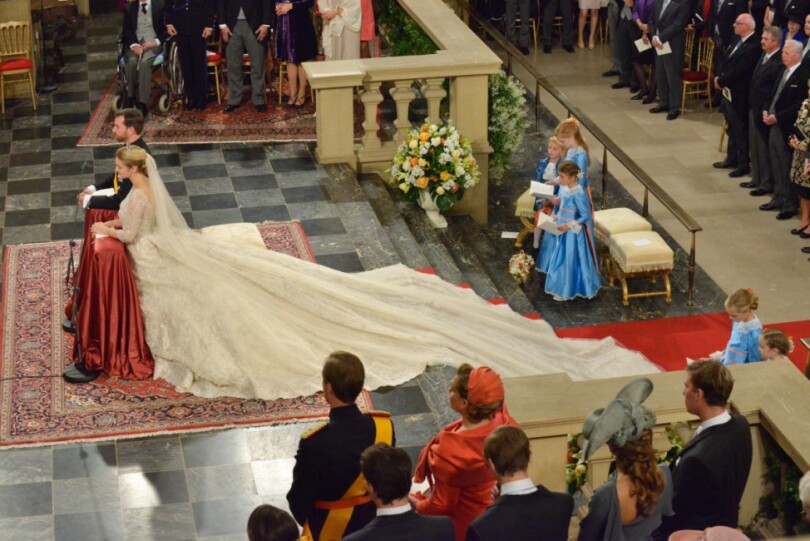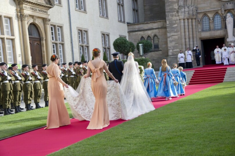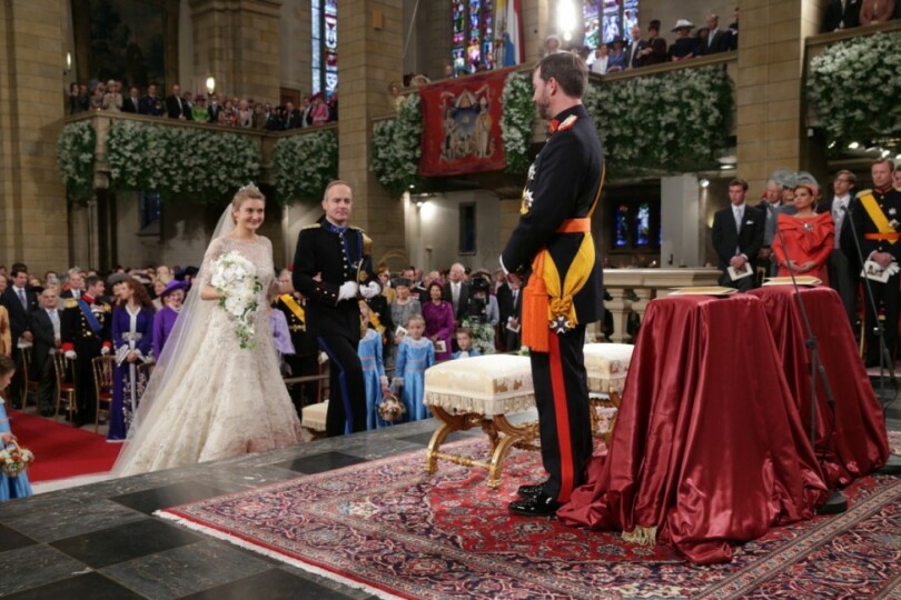 Fait sans précédent dans les annales luxembourgeoises, lorsque Guillaume et Stéphanie remontent la nef au bras l’un de l’autre, l’assistance entière applaudit à tout rompre. Suivent familles et invités royaux, parmi lesquels Albert II et Paola de Belgique, Beatrix des Pays-Bas, Silvia de Suède, Margrethe et Henrik de Danemark, Harald et Sonja de Norvège, Hans Adam et Marie de Liechtenstein, le prince héritier Naruhito du Japon et l’essentiel des princes héritiers d’Europe. Ainsi que Caroline de Hanovre, Edouard et Sophie de Wessex, parmi d’autres…