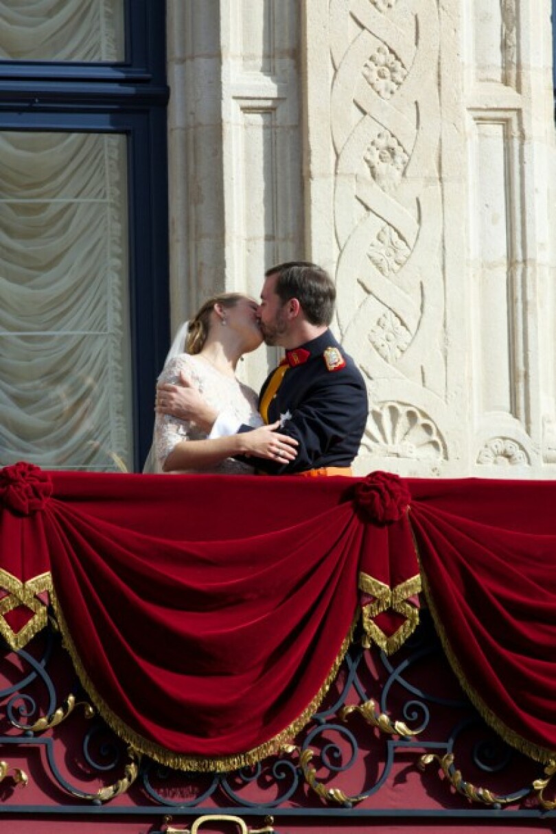 Une porte s’ouvre, les voilà, Stéphanie d’abord, un peu embarrassée par la longueur de sa traîne, puis Guillaume qui arrive à la rescousse. Vive! Vive! scandent les Luxembourgeois avant de réclamer un baiser. Le grand-duc héritier rit, heureux comme un adolescent puis enlace la mariée, l’embrasse avec fougue avant de lui faire signe de la main, espiègle, un deuxième?