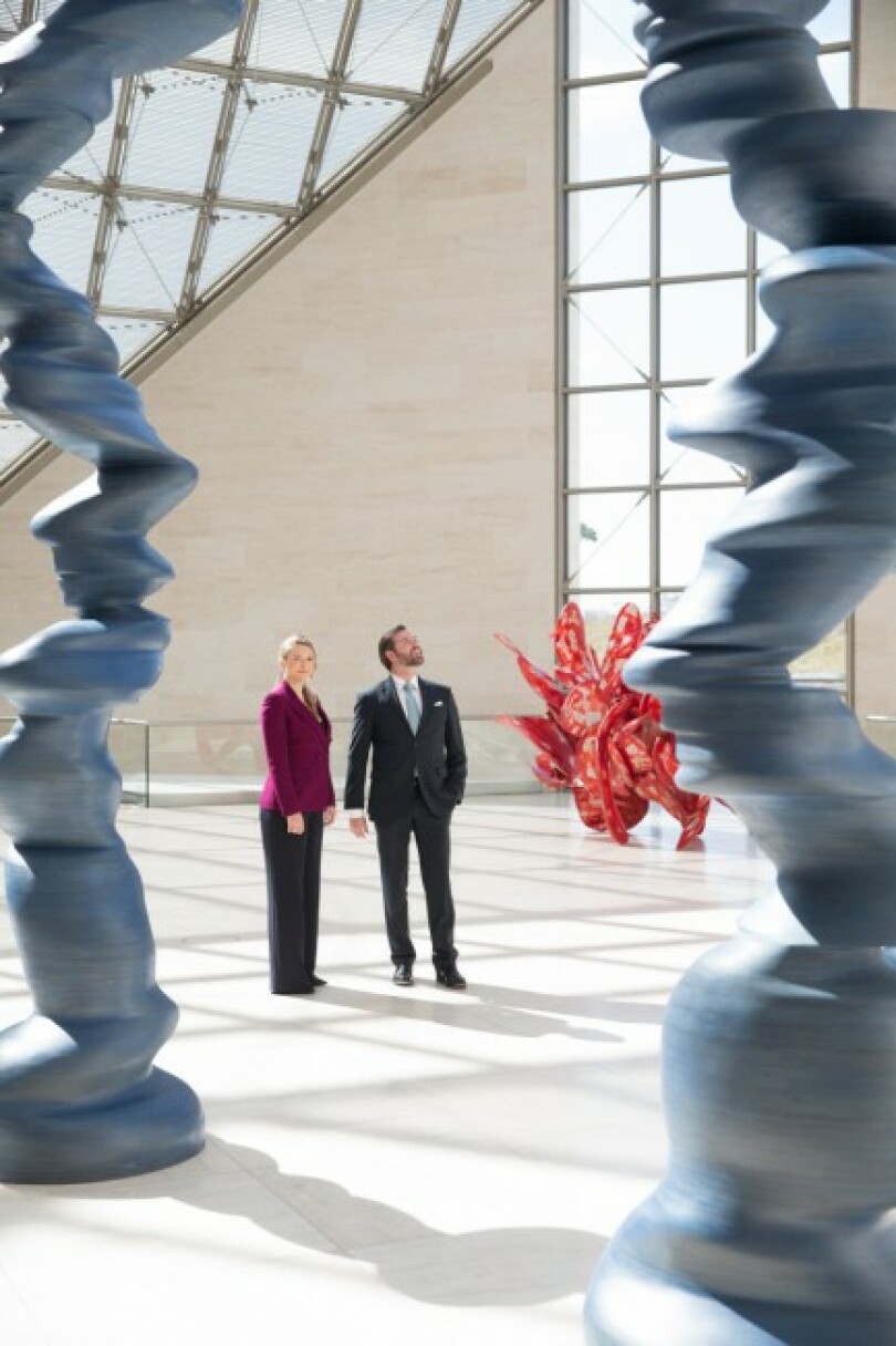 Dans le lointain, comme un trait rouge et mince, le pont Grande-Duchesse-Charlotte relie la vieille ville à la modernité des buildings du Kirchberg. "C’est là que sont les institutions européennes basées au Luxembourg, mais aussi la Philharmonie, conçue par Christian de Portzamparc, et le Mudam, le musée d’Art moderne, oeuvre de l’architecte Ieoh Ming Pei, dont je préside le conseil d’administration depuis janvier 2016, poursuit la princesse Stéphanie. J’étais déjà très impliquée dans l’art avec le haut patronage des Amis des musées de Luxembourg. C’est une excellente fenêtre par rapport à l’étranger. Le Mudam a d’ailleurs une reconnaissance internationale et accueille des expositions des plus grands artistes contemporains, comme Tony Cragg en ce moment. Le bâtiment est extraordinaire de beauté et intègre une partie du vieux fort Thüngen. Une manière d’enraciner l’art d’aujourd’hui dans celui du passé."