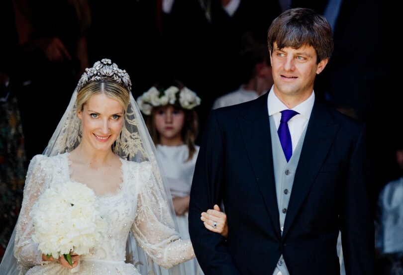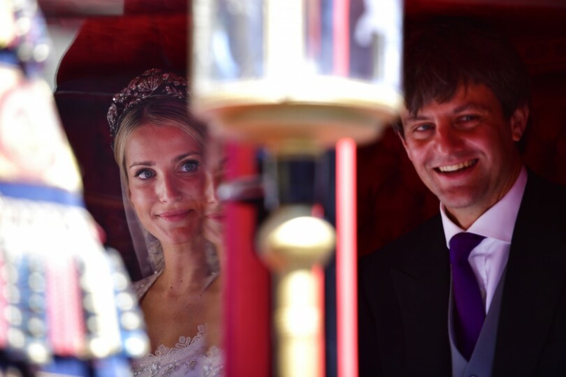 À l’issue de la cérémonie les deux époux prennent place dans le carrosse où sont montés le roi Georges V, l’arrière-arrière-arrière-grand-père du marié, et Marie de Saxe-Altenbourg pour leur mariage, ici même à Hanovre, en 1843. Les demoiselles d’honneur Alexandra de Hanovre et la réalisatrice Dina Amer se précipitent pour soulever la longue traîne de la robe en dentelle brodée ton sur ton de motifs d’inspiration russe.