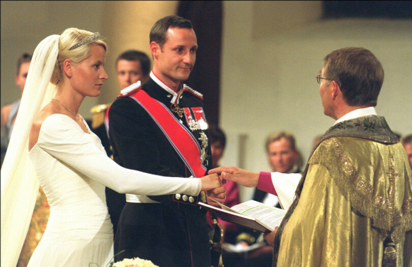 Quand l’évêque protestant, la main sur leurs têtes, bénit Haakon et Mette-Marit, ils prononcent le ja sacramentel. Le couple échange de simples alliances d’or blanc, offertes par la guilde des orfèvres norvégiens et dessinées par Ester Helen Slagsvold. À l’intérieur sont gravés les mots "Bonne chance".