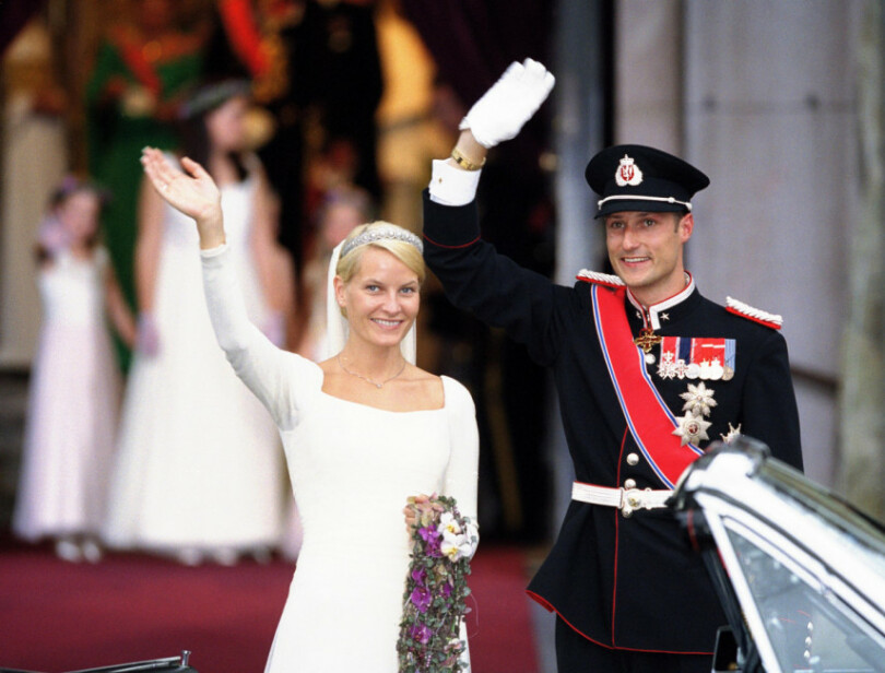 Massés sur la place Stortovet, malgré un ciel menaçant, des milliers de Norvégiens attendent l’arrivée de Mette-Marit. Son père, le journaliste Sven O. Hoiby, en queue-de-pie, est déjà installé dans le chœur de la cathédrale Saint-Sauveur d’Oslo. Il ne conduira pas sa fille à l’autel. Haakon, le fiancé, lui a demandé de lui abandonner ce privilège. Un peu avant 17 heures, les cloches sonnent à toute volée. Sanglé dans son uniforme d’officier, gants blancs, épée au côté et la poitrine constellée de décorations, le prince héritier s’avance sur le tapis rouge. Souriant, il donne très solennellement le bras à sa fiancée qui descend de la limousine.