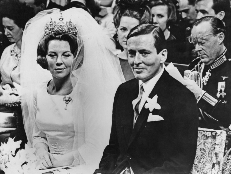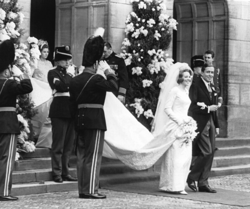 Mille six cents invités, au premier rang desquels rois, reines et princes venus de l'Europe entière, admirent la robe de la mariée, dessinée par ses soins et coupée dans du satin de soie surbrodé de motifs en forme de diadèmes. Le voile est justement tenu par le diadème en perles et brillants que portait la reine Wilhelmine pour son propre mariage, en 1901. Malgré les cris quelques minutes plus tôt, malgré les fumigènes, Beatrix est radieuse.