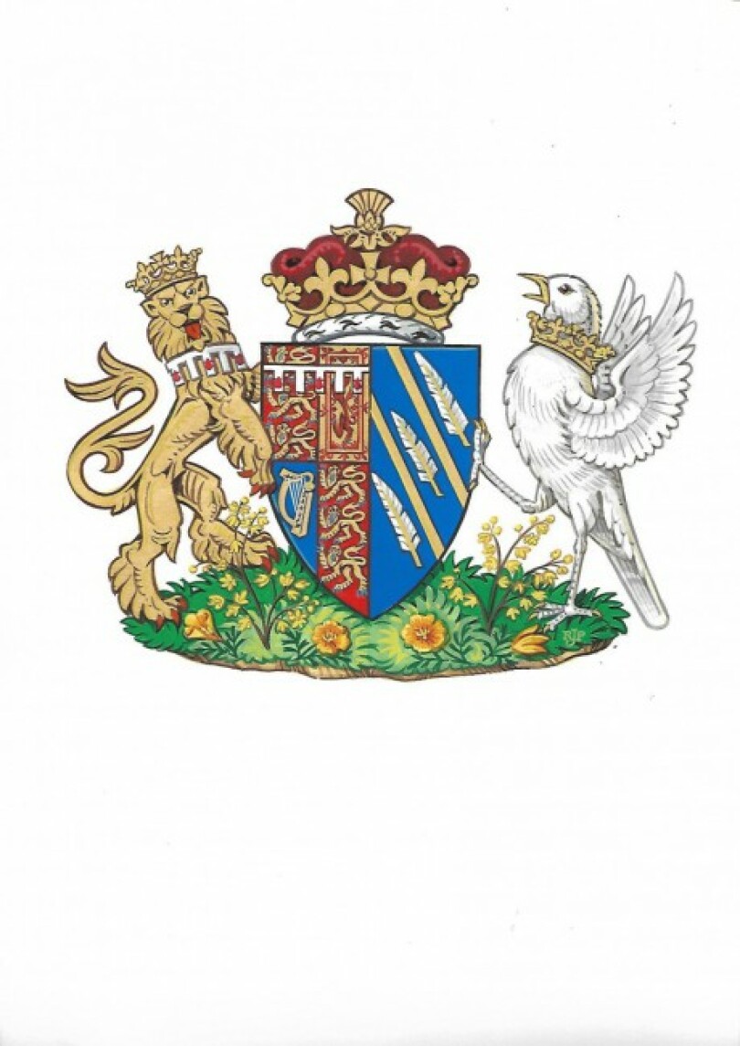 Si à dextre -à droite pour le porte-bouclier-, le lion d’Angleterre tient toujours l’écu, un rossignol blanc au bec ouvert et ailes déployées, donc libre de s’exprimer, a relégué aux écuries la licorne traditionnelle à sénestre -gauche-. La duchesse de Sussex, enfin, porte la couronne de son époux, alternant croix pattées, fleurs de lys et feuilles d’ache -céleri sauvage- des "fils et filles de l’héritier apparent", autrement dit, le prince de Galles.
