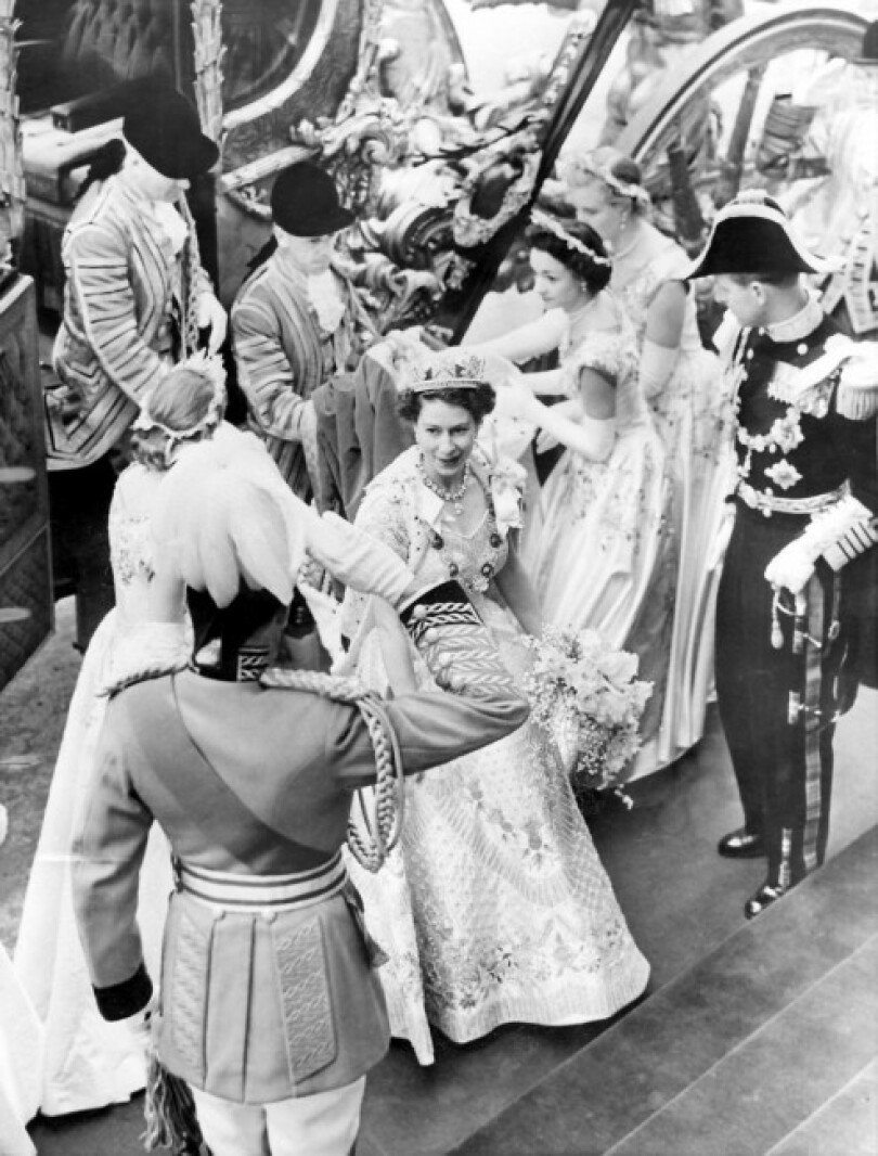11 heures. Une onde court, cri de joie immense venu de loin, poussé par un million de poitrines jusque devant l’entrée de l’abbaye de Westminster. C’est le carrosse d’or qui s’avance, somptueux et baroque à l’extrême avec ses tritons et ses coquillages sculptés. Les roues ont été spécialement cerclées de caoutchouc pour limiter les soubresauts. Calme, véritablement souveraine, Élisabeth II, coiffée du diadème d’État de George IV, salue une foule ivre d’enthousiasme. Auprès d’elle se tient le duc d’Édimbourg, superbe dans son grand uniforme d’amiral. Saisis d’un légitime orgueil, laquais, postillons, valets de pied en culottes à la française semblent des statues dont nul ne s’explique comment elles peuvent avancer. Pas moins de quatre pelotons de la cavalerie de la garde font escorte à leur reine.