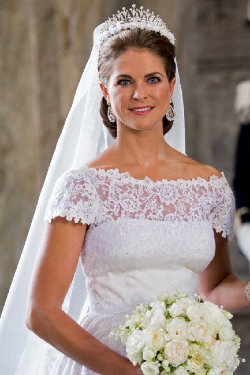 Madeleine, qui s’avance au bras de son père, est tout simplement ravissante. Pour sa robe, Valentino a imaginé un large décolleté bateau en dentelle chantilly de couleur ivoire, qui se prolonge en de courtes manches sur les épaules de la princesse. Serré à la taille, le jupon s’évase ensuite en un tourbillon de tissu où l’organza de soie se mêle à la dentelle qui pare également le voile long de 4 mètres.