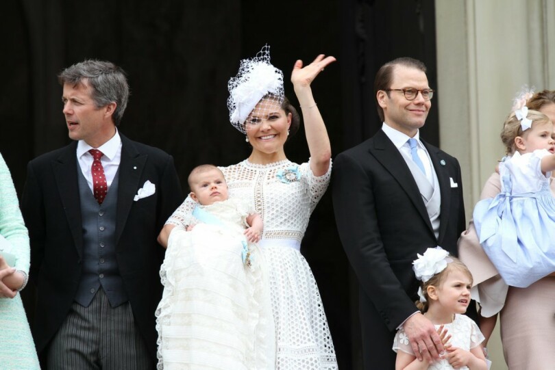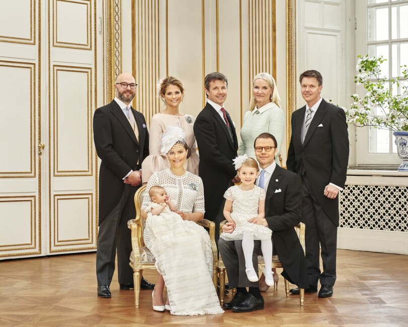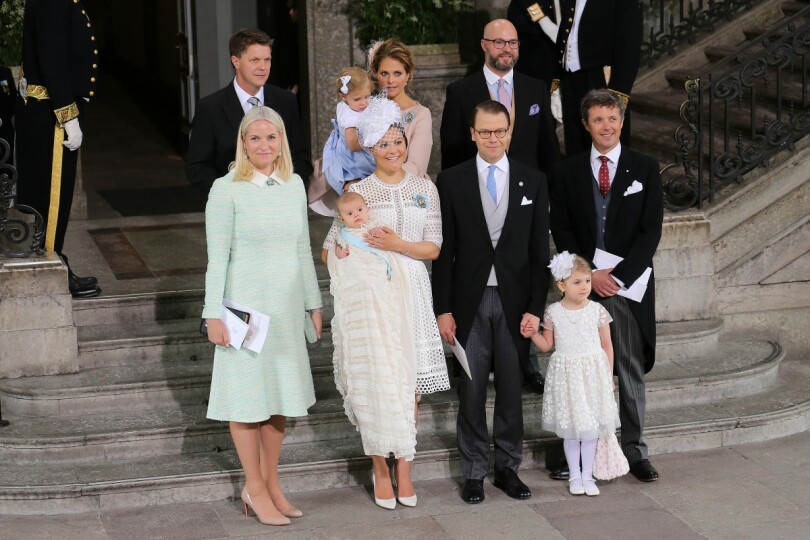 Serrant fermement la main de Daniel, Estelle arbore fièrement son expression la plus sage et une tenue presque semblable à celle de sa maman. Derrière eux, le prince Frederik de Danemark et la princesse Mette-Marit de Norvège, heureux parrain et marraine, devisent gaiement. Pour ce rôle important, le couple princier a également choisi Oscar Magnuson, cousin de Victoria, et Hans Astrôm, cousin de Daniel et gloire nationale de hockey sur glace, et bien sûr Madeleine.