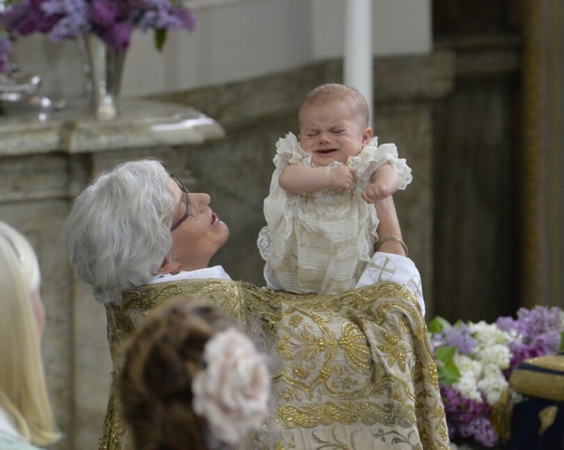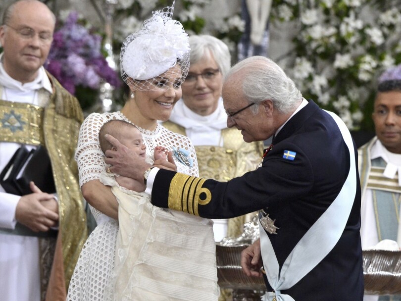 Les douze coups de midi n'ont pas fini de retentir que déjà la famille princière s'avance. Victoria, dans une robe printanière en broderie anglaise griffée Self-Portrait, porte dans ses bras le roi de la fête, à peine éveillé. Oscar a bien sûr revêtu l'immense robe de baptême en satin et dentelle de Valenciennes, confectionnée pour son aïeul le prince Gustaf Adolf en 1906. À l'intérieur de la cape de cérémonie qui l'accompagne, on peut lire, délicatement brodés, la litanie des prénoms royaux de tous ceux qui l'ont portée.
