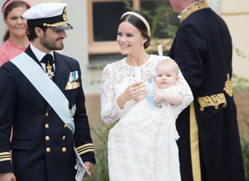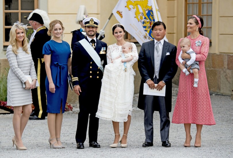 Derrière eux sont placés les parrains et marraines: la princesse héritière Victoria, avec son fils Oscar, Lina Fredj, la sœur de la princesse Sofia, et Cajsa Larsson, sa meilleure amie, Victor Magnuson, le cousin de Carl Philip, et Jan Ake Hansson, qui fut son témoin de mariage. Johan Dalman, le chapelain du palais, prend la parole pour initier la cérémonie. Sa chasuble brodée de dorures fascine le futur baptisé presque autant que les voix claires du chœur d'enfants de Stockholm, qui entonne le psaume 248.