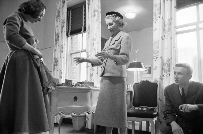 Puis, un ange passe. Un fidèle parmi les fidèles. "L’arbitre de toutes les fêtes, de toutes les élégances, Christian Bérard, notre cher Bébé, au goût infaillible, venait, escorté de Jacinthe, sa chienne, nous rendre visite et respirer l’air de la collection qui s’apprêtait. Nous attendions le coeur battant son verdict. Ce fut lui qui nous conseilla de tendre de la toile de Jouy et de prodiguer partout, sur les armoires ou dans les angles, des cartons à chapeaux portant le nom de la maison. Sous un apparent désordre, il avait créé la vie."