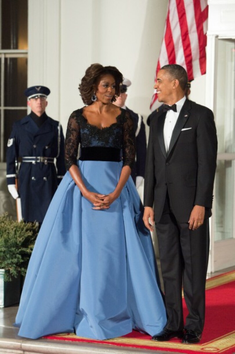 Tradition oblige, les First Ladies, comme Laura Bush, puis Michelle Obama, sont habillées par la créatrice et son directeur d’atelier. Pour la visite d’État de François Hollande à Washington en février 2014, il dessine pour madame Obama une robe au bustier de dentelle noire sur un large jupon bleu en faille de soie. "Elle est très grande et sait très bien ce qui lui va", remarque-t-il. La dernière fois qu’il l’a habillée, c’était pour le voyage à Cuba du couple présidentiel en 2016.