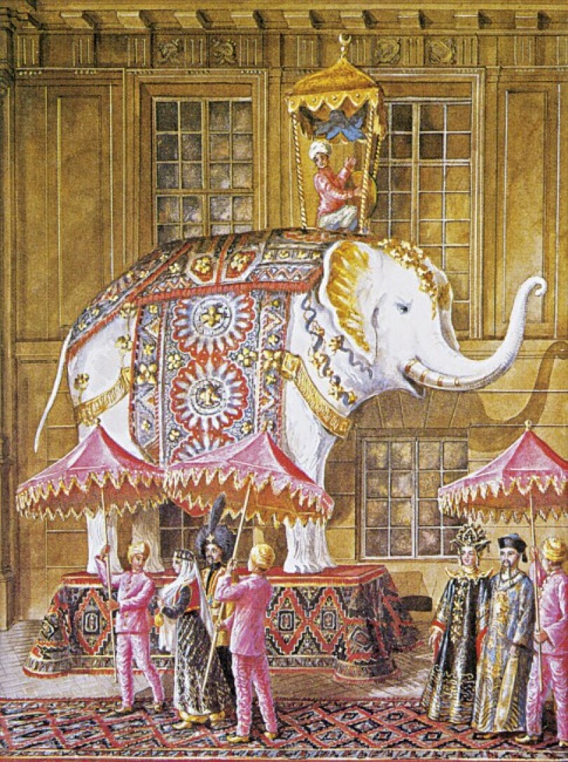 Deux éléphants blancs grandeur nature et carapaçonnés d’or se dressent dans l’encre de la nuit. Sur les pavés de la cour d’honneur avance au son des cymbales et des cithares une foule de génies enturbannés, de maharadjahs aux tuniques ruisselant de pierreries, de divinités coiffées de perles et de plumes, de guerriers des steppes lointaines et de princesses du désert. Seize esclaves nubiens, torchère à la main, accueillent ce cortège fantasmagorique à l’entrée des salons parfumés de myrrhe et de jasmin.